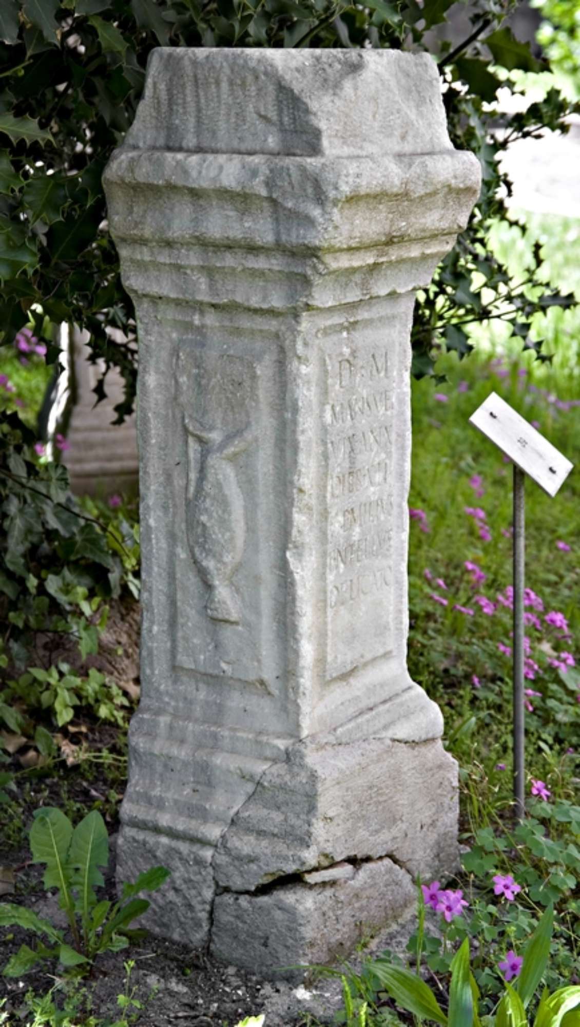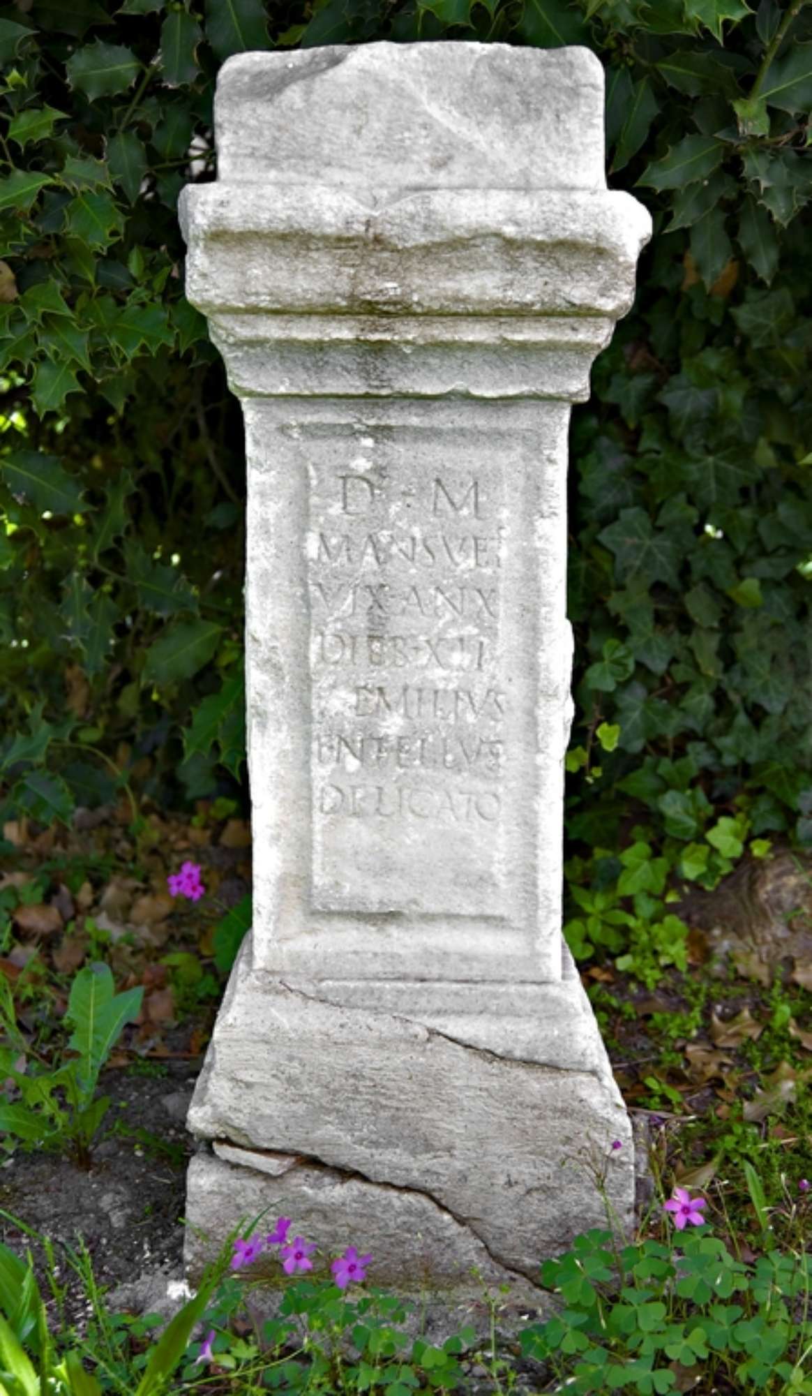 Piccolo cippo in marmo con coronamento inornato; ai fianchi è decorato da patera e urceo a bassorilievo. L'iscrizione è racchiusa da una semplice cornice in incavo e si svolge su sette linee. Il monumento, di destinazione funeraria, è dedicato al piccolo Mansuetus, di dieci anni. Nella forma imita in dimensioni ridotte il tipo classico del cippo. L'iscrizione è redatta in lettere piuttosto irregolari come incisione (solco leggero, spesso corretto). Non è indicata la parentela del fanciullo con il dedicante