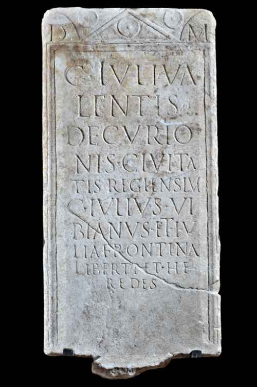 Stele frammentaria, corniciata ai lati con un semplice doppio solco che delimita una fascia a cordone; si intravede anche il limite superiore della cornice. Il testo, accuratamente composto, resta per otto linee di scrittura. È probabile che l’invocazione ai Mani fosse contenuta in frontoncino che completava la stele. Il nesso fra M ed I alla linea cinque è ottenuto con un approfondimento del solco della M ed una più evidente apicatura della stessa lettera