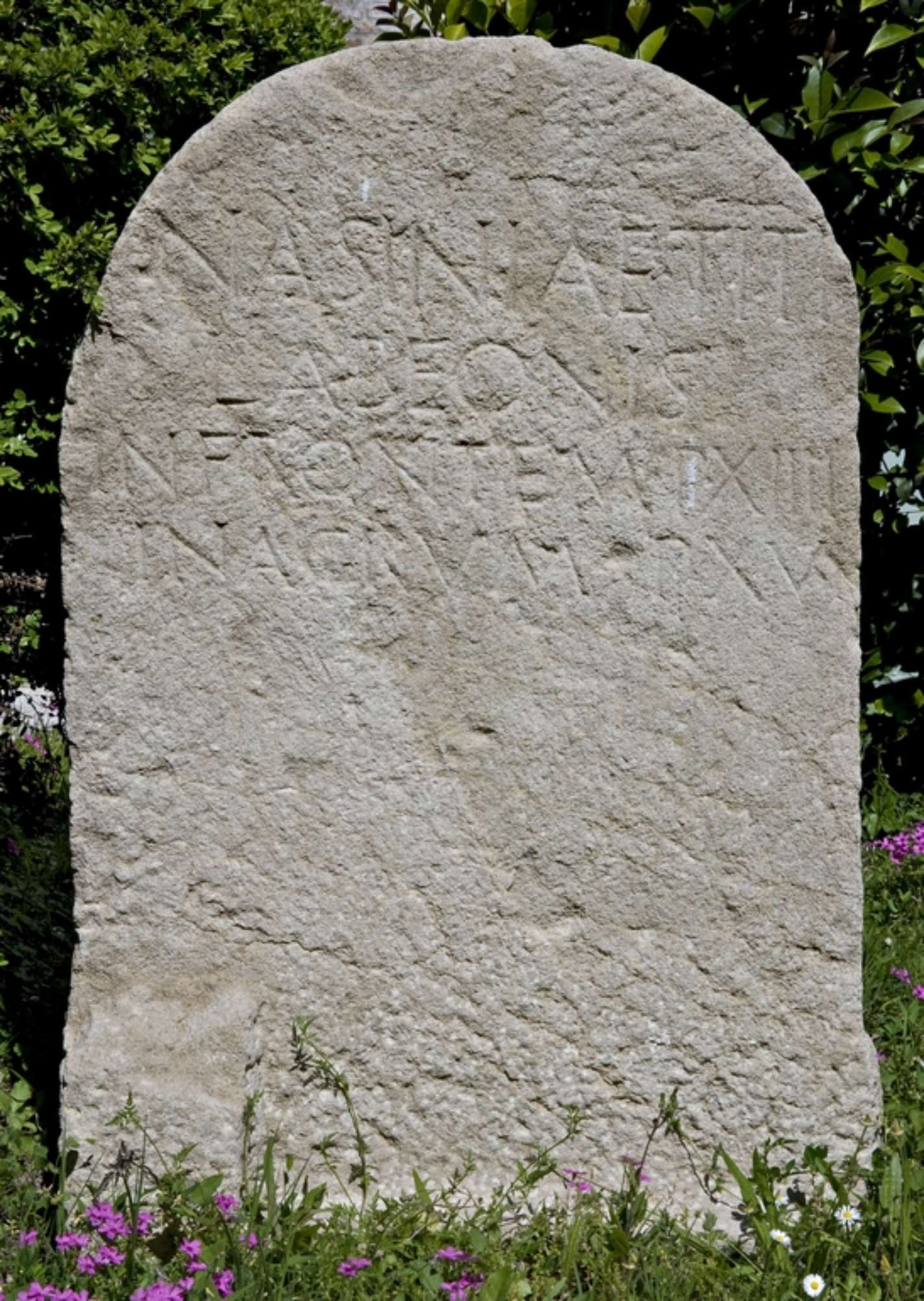Cippo funerario centinato alla sommità e privo di decorazioni. La superficie è levigata sul fronte anteriore ad eccezione dell’alto zoccolo di infissione nel terreno che si differenzia per la scalpellatura più rozza e per il maggior spessore (cm 21). Questa e l’epigrafe ER/64 b) costituivano i cippi terminali di un’area sepolcrale; infatti in ER/64 a) lo zoccolo forma una prominenza rettangolare di maggior altezza sul fianco sinistro, mentre in ER/64 b) la si riscontra sul lato destro. Il testo, più ordinato e curato in questa iscrizione, ricorda il nome della defunta e l’estensione dell’area sepolcrale