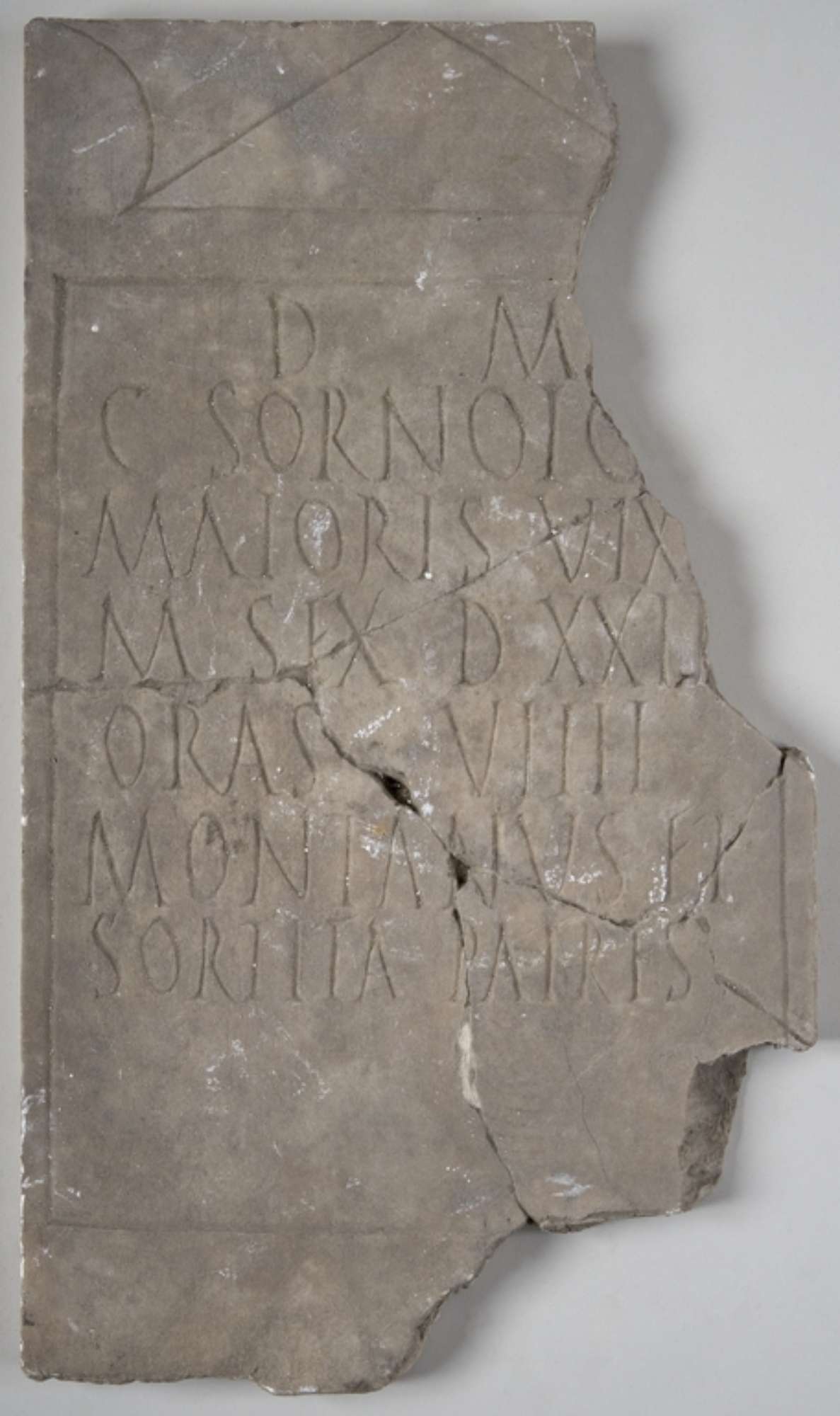 Stele funeraria corniciata con un semplice solco e sormontata da un frontoncino triangolare affiancato da semiacroteri lunati. L’iscrizione è posta dai genitori in memoria del figlio di pochi mesi; sono indicati anche i giorni e le ore di vita del bambino. È chiaramente visibile, sotto la quinta linea, una linea di guida graffita, irregolare, corretta e non rispettata. Si noti inoltre l’andamento mosso dei tratti orizzontali delle lettere