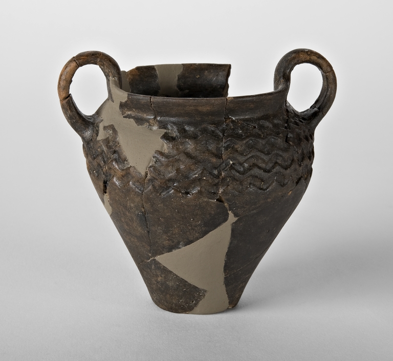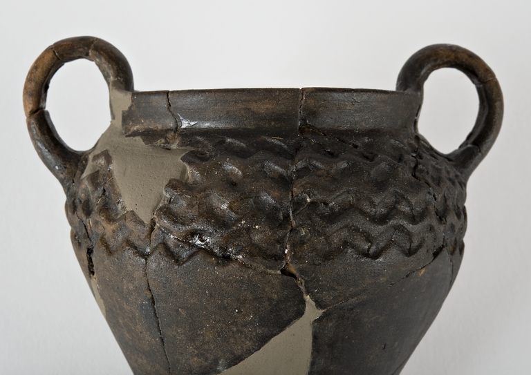 Anforetta in argilla semidepurata bruna, orlo arrotondato e ingrossato, brevissimo collo cilindrico, 2 anse sormontanti a bastoncello impostate sull'orlo e sulla spalla, corpo troncoconico, fondo piatto; decorata a stampiglie con motivo a onde.