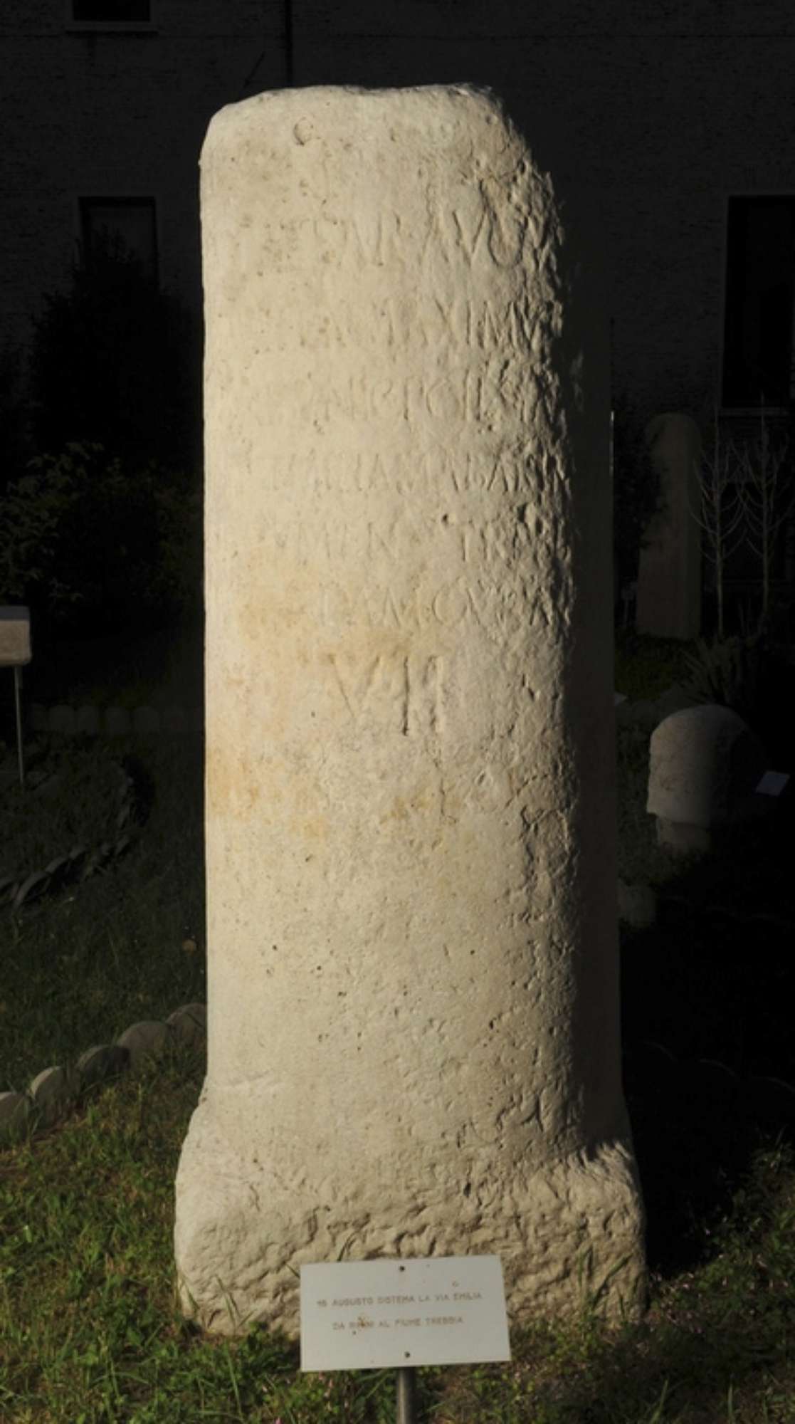 Il cippo fu ritrovato ancora in posto, in posizione verticale e rende quindi sicura testimonianza del punto preciso in cui passava la via Emilia all'epoca di Augusto. Il testo non rappresenta una novità: è identico infatti a quello del miliario ritrovato a Borgo Panigale (Bologna, cfr. C.I.L., XI, n. 8103). In fondo al testo compare l'indicazione di distanza da Rimini in miglia sette