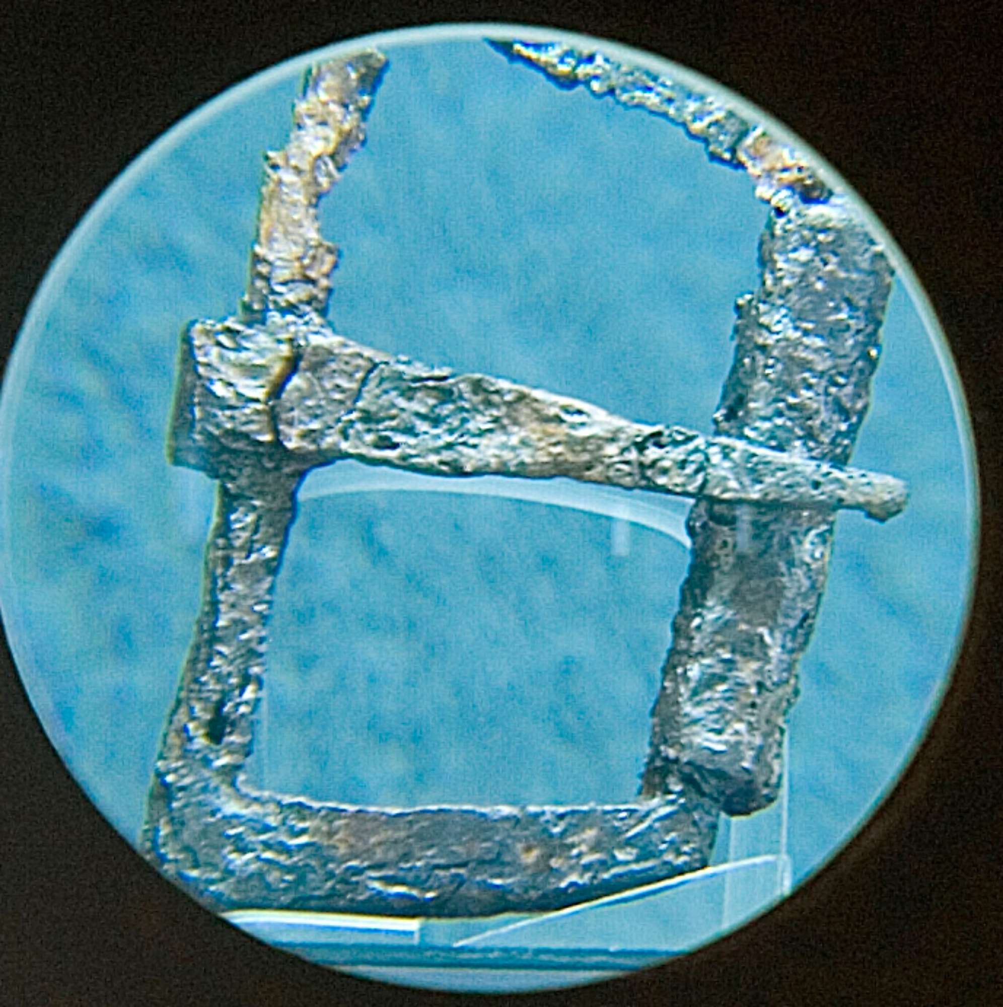 Fibbia in ferro trapezoidale, articolata con ardiglione e rotolo aggiunto alla traversa superiore.