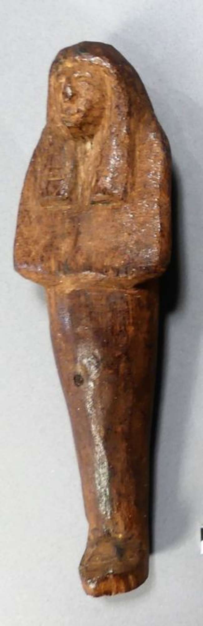 Statuina ushabti realizzata in legno di tamerice, del tipo del servitore mummiforme. Si nota l’attributo della parrucca tripartita, mentre il resto appare schematico: le mani, affrontate, sono prive di attributi datanti; il retro è privo di accessori.