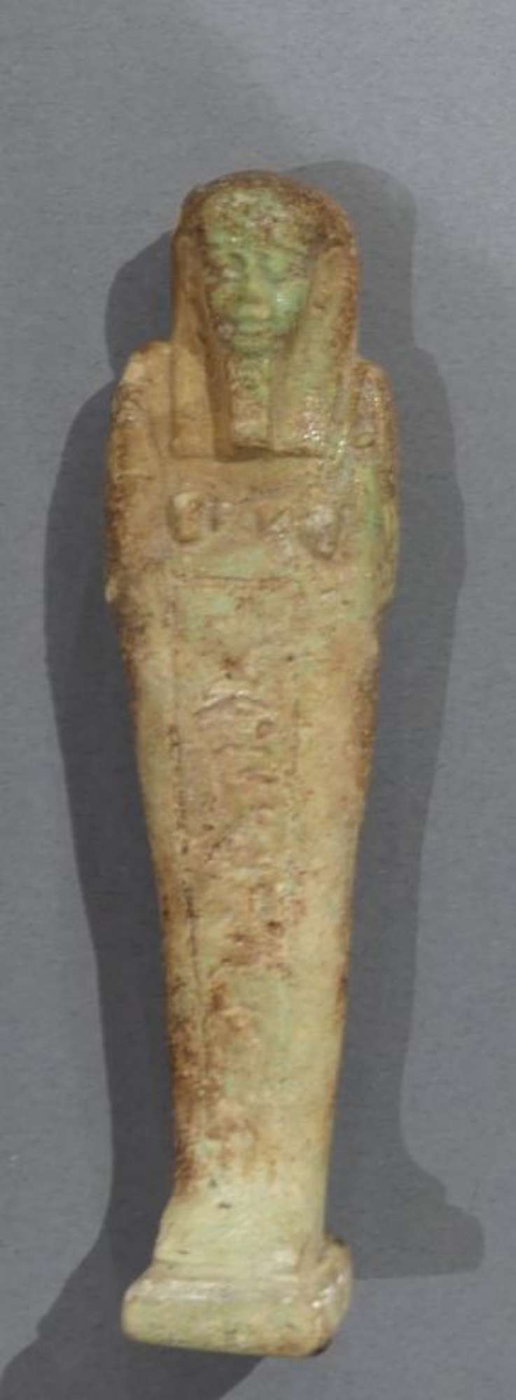 Statuina ushabti in faïence verde, piuttosto corrosa. L’insieme delle sue caratteristiche consente di collocarla in un ambito cronologico che va dalla metà della XXV dinastia (746-655 a.C.) all’Epoca Greca (306/304-30 a.C.). Sono infatti presenti il falcetto e la zappa, la borsetta sulla spalla sinistra, il pilastrino dorsale e la base di appoggio. La statuina conserva parte di una colonna di testo in cui è verosimile riconoscere la formula per “Glorificare l’Osiride” e il nome del defunto Djed-Hor-iu-ef-[ankh], seguita da un’indicazione genealogica purtroppo compromessa.