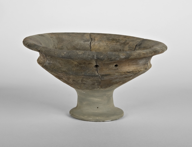 Piattello su alto piede con labbro a tesa, vasca troncoconica profonda, che reca due piccoli fori passanti affiancati.