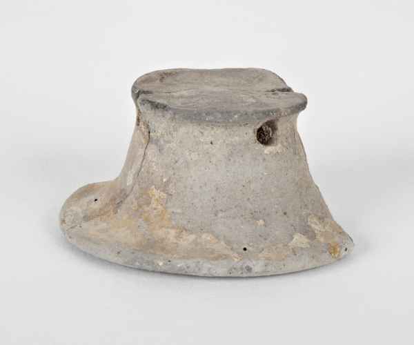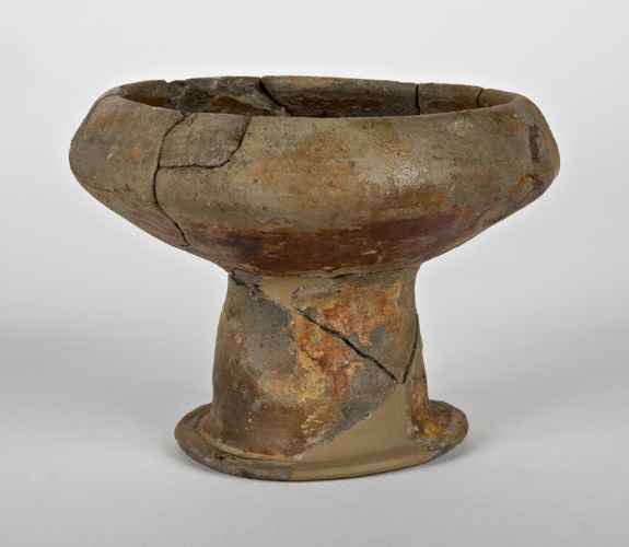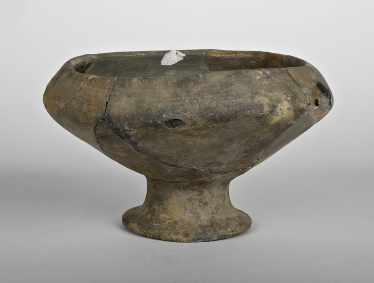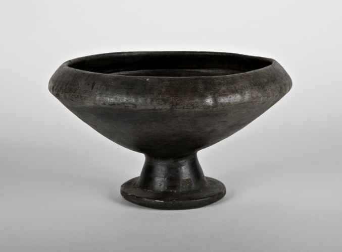 Coppa su piede a labbro rientrante rettilineo, profonda vasca troncoconica, basso piede svasato profilato cavo.