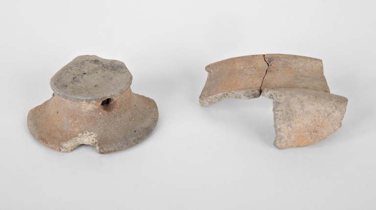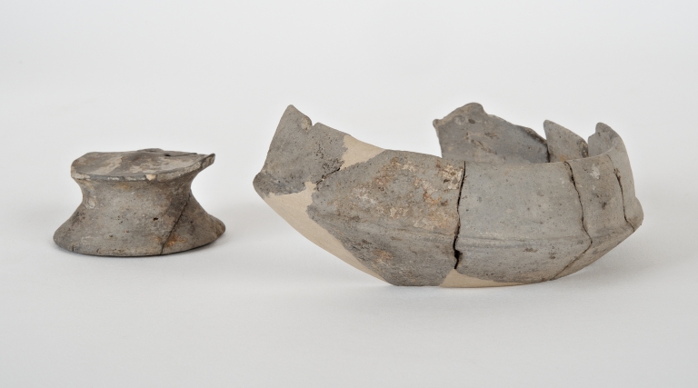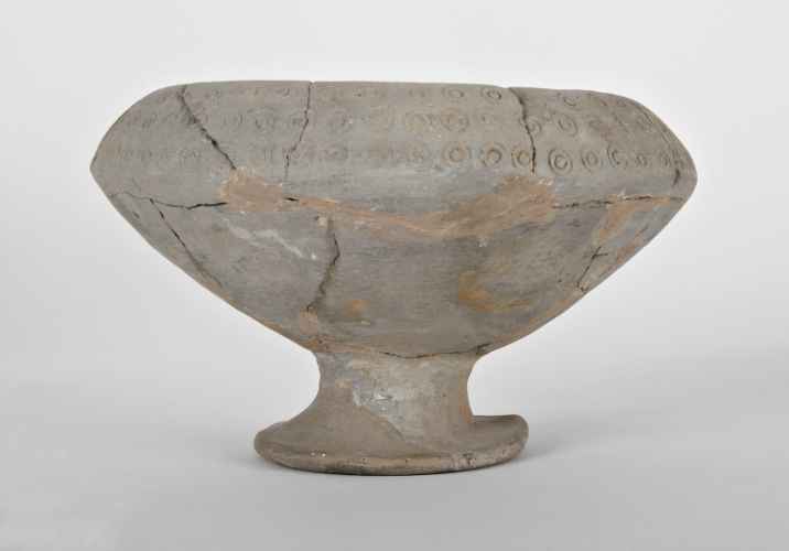 L'oggetto appartiene al corredo funerario della tomba 24 rinvenuta da G.V. Gentili nel 1969 nella necropoli Moroni di Verucchio. Si tratta di una tomba a pozzetto circolare molto profondo, in cui i resti della defunta erano collocati dentro ad un ossuario interamente avvolto in un vestito di lana deposto sopra un cesto di vimini e circondato da dieci paletti in legno conficcati verticalmente nel riempimento del pozzetto. Il corredo è molto ricco e comprende ornamenti personali, strumenti da filatura e tessitura ed un ricco set da banchetto con scodelle e tazze, alcune delle quali contenevano offerte di cibo.
