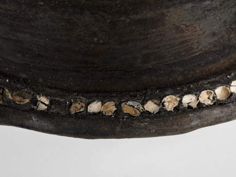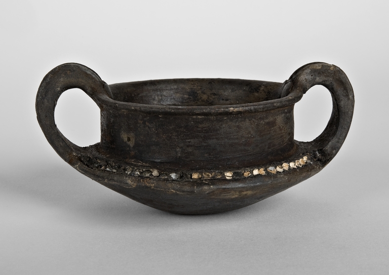 Tazza biansata con imboccatura ovale, spalla pronunciata e anse bicostolate con due bugne circolari alla sommità, nel punto di raccordo all'orlo. Spalla e anse sono decorate da cerchielli in osso.