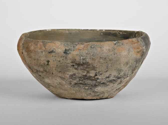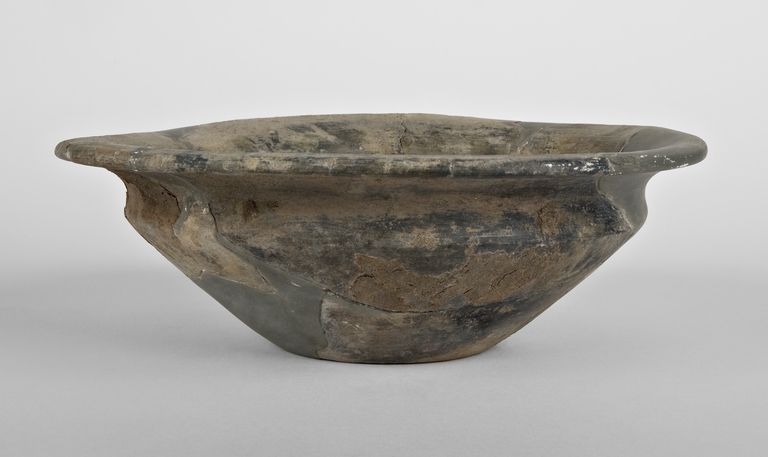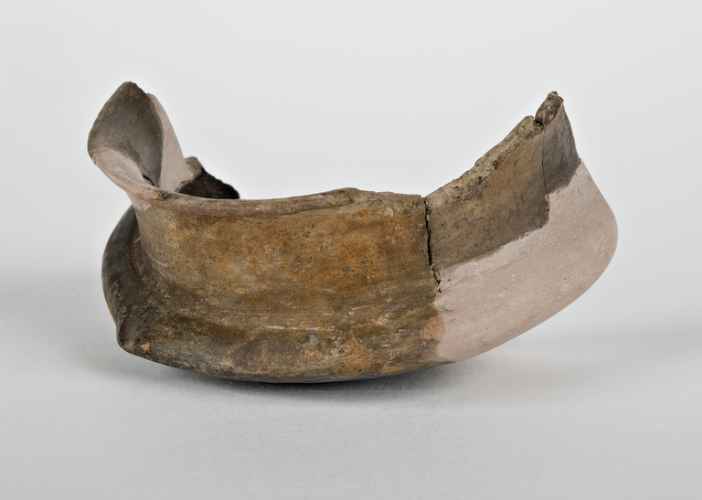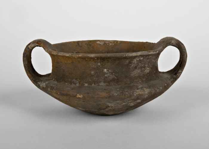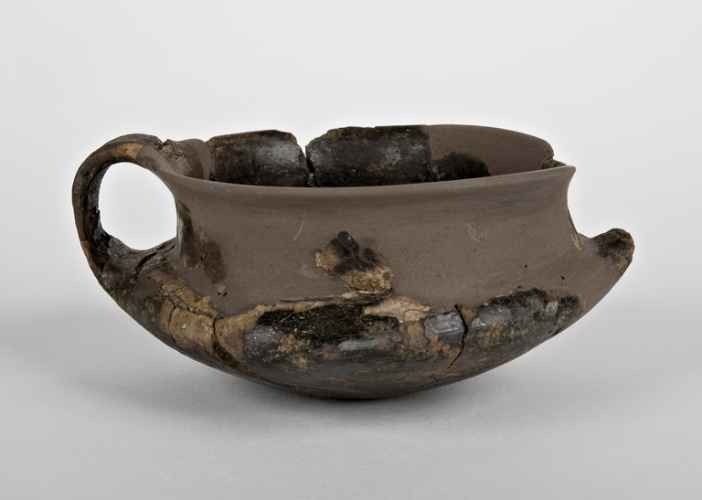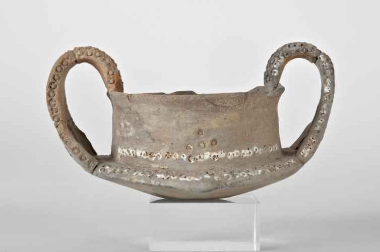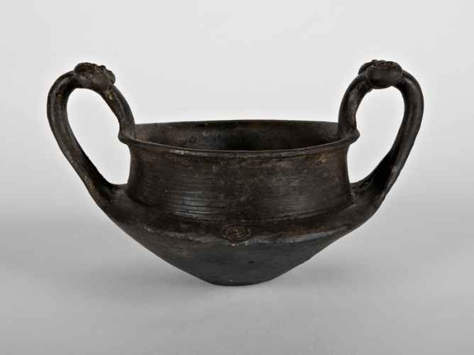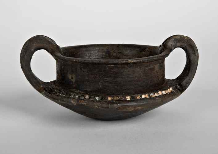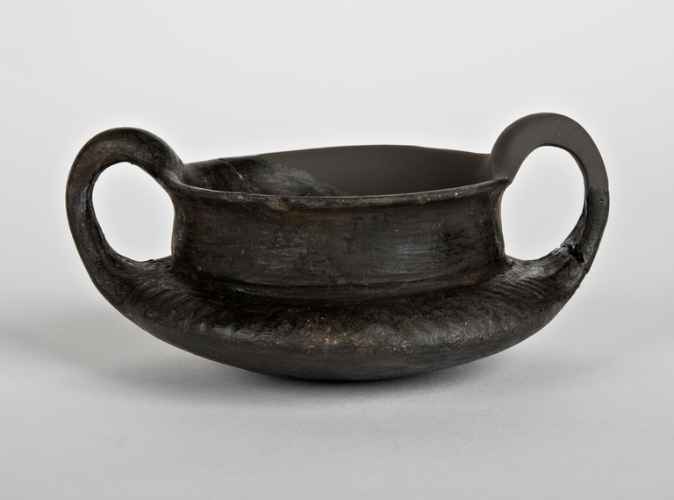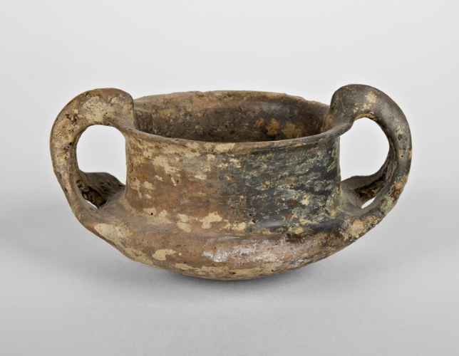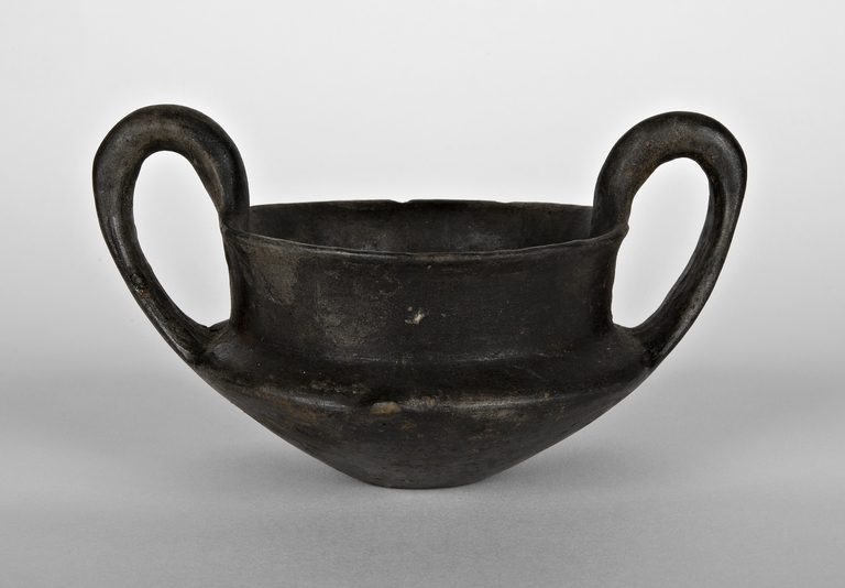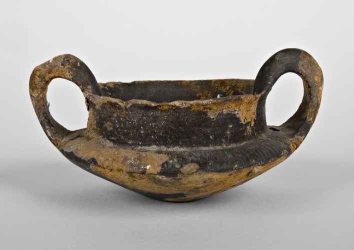 Piccola tazza biansata con imboccatura ovale, collo troncoconico, spalla prominente con bugne, fondo piano, anse a bastoncello sormontanti.