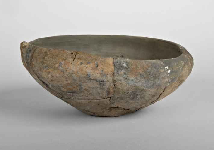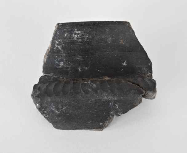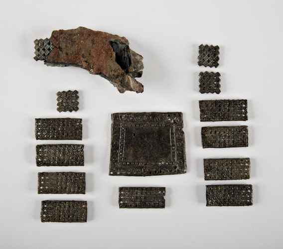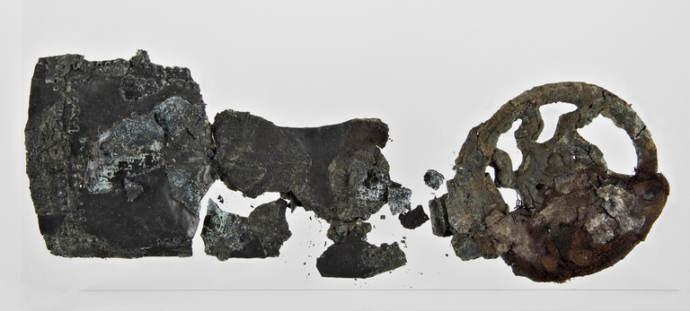 L'oggetto appartiene al corredo funerario della tomba 26 rinvenuta da G.V. Gentili nel 1969 nella necropoli Moroni di Verucchio. Si tratta di una tomba a pozzetto chiuso da un asse ligneo che copriva il dolio, con tracce del tessuto della vestizione, al cui interno si trovavano il cinerario biconico con la sua scodella di copertura. Gli oggetti del corredo stavano dentro al cinerario e sul fondo del dolio, mentre nella zona a est del pozzetto era collocata la terra di rogo con i resti del corredo combusto, le decorazioni in osso del letto funebre, il vasellame e sopra questi un trono in legno con accanto il suppedaneo.