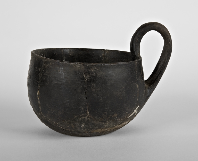 Boccale con imboccatura ovale e corpo globulare, ansa a nastro sormontante.