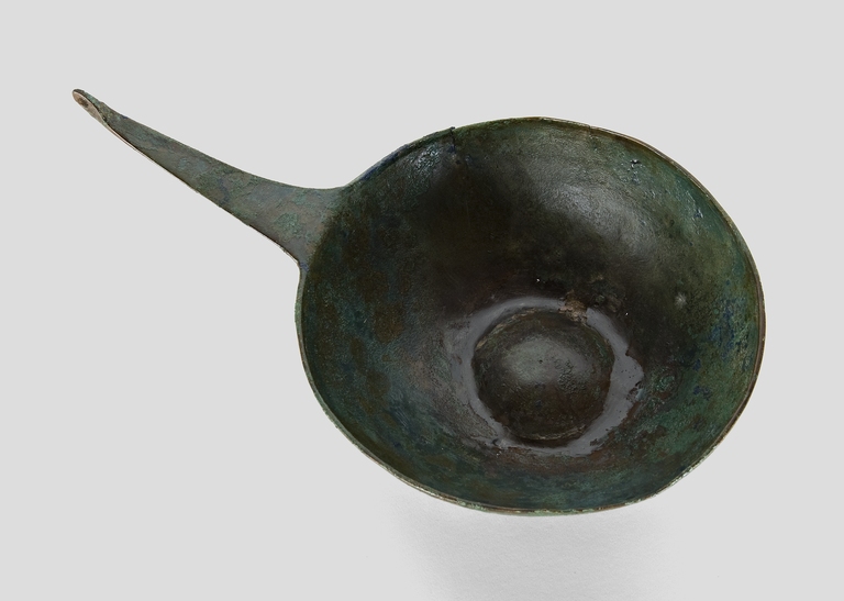 Padella concava con fondo umbonato decorato esternamente da due coppie di linee parallele incise e corto manico nastriforme con terminazione ingrossata forata.