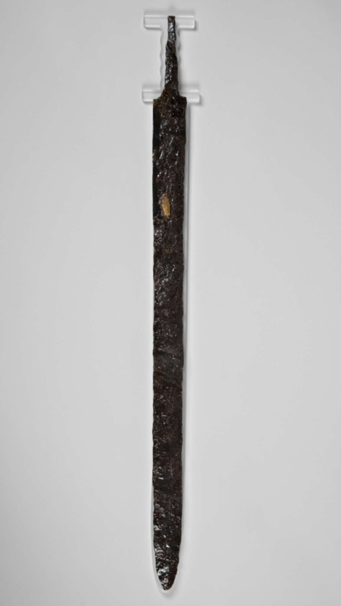 Lama di spada in ferro a doppio taglio (spatha) con codolo privo di pomo. Su entrambi i lati della lama si trovano parti di legno verosimilmente riconducibili al fodero in cui era contenuta.