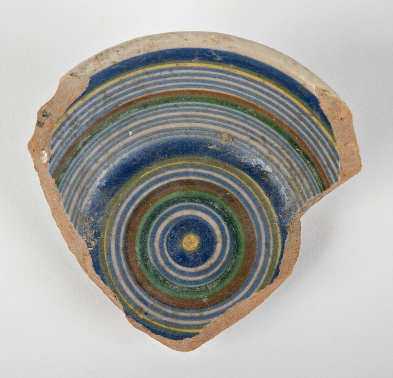 Frammento di ciotola a calotta emisferica, con piede a disco. Il recto è decorato con sequenze di fasce concentriche. Dipinto in arancio, blu, verde e giallo su smalto bianco.
