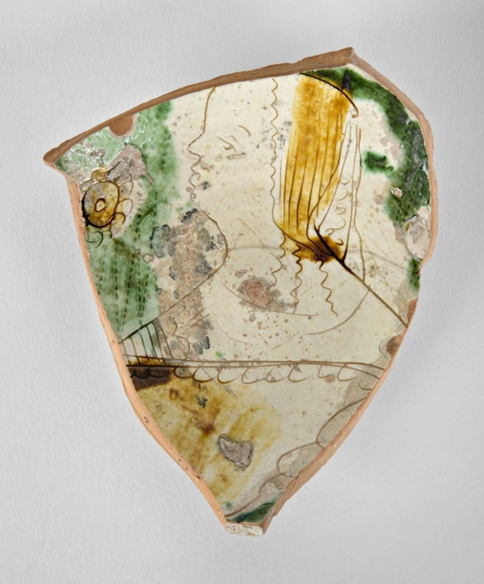 Fondo di ciotola, decorazione graffita a punta e invetriata. Colori: bruno “ferraccia” e verde “ramina”. Al centro busto femminile.