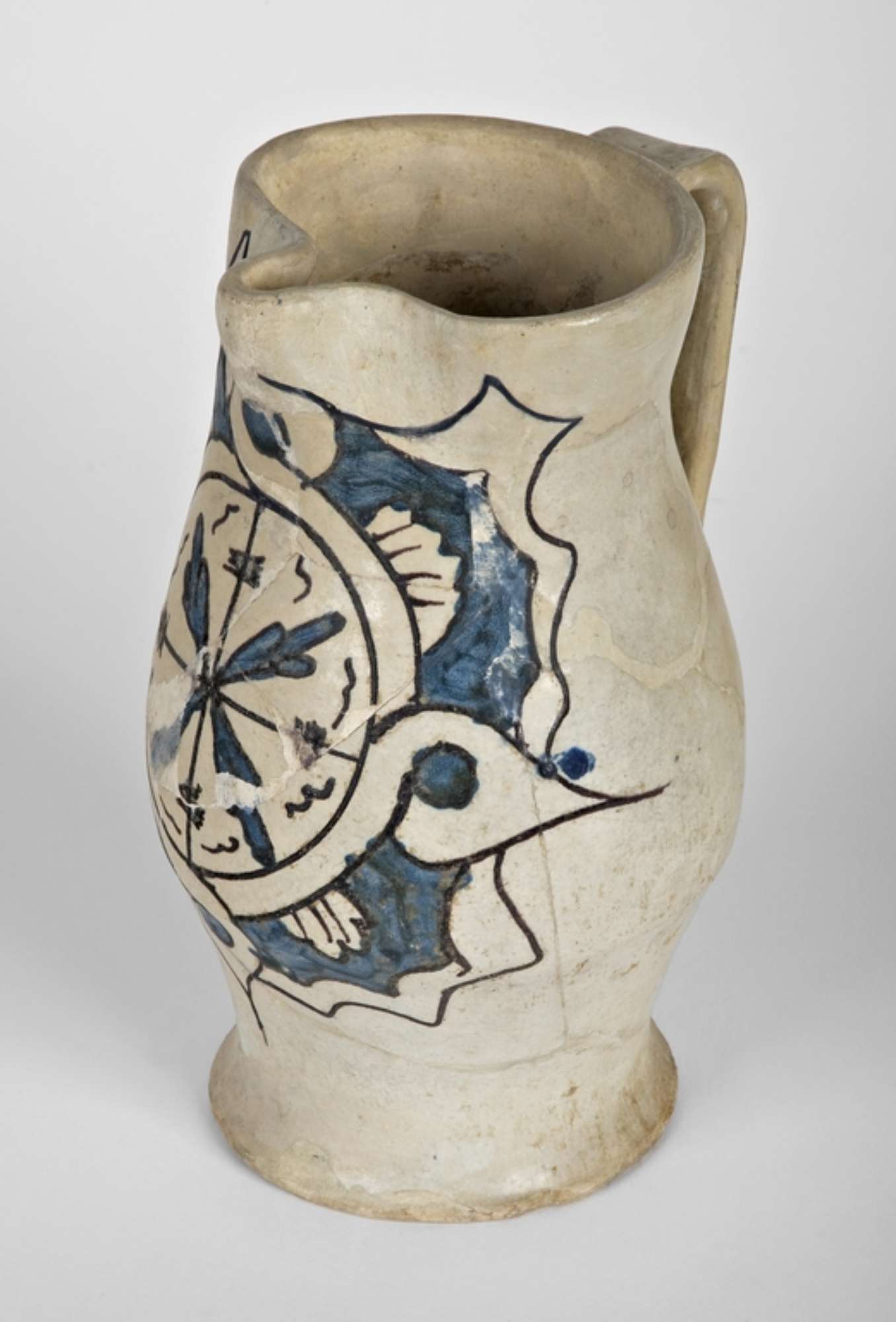 Boccale biconico, in maiolica arcaica, decorazione dipinta a zaffera a rilievo e diluita e manganese. Al centro una sorta di scudo.