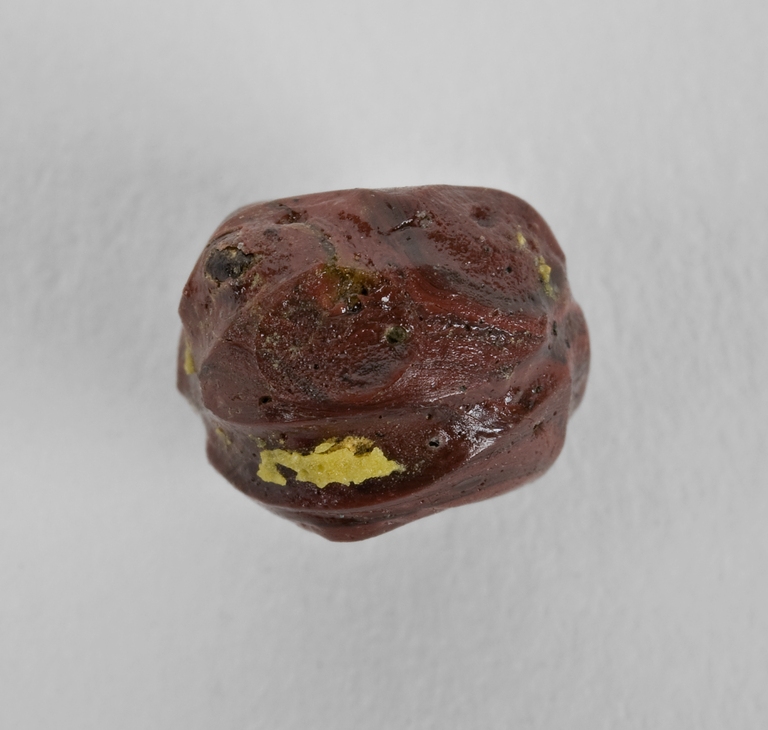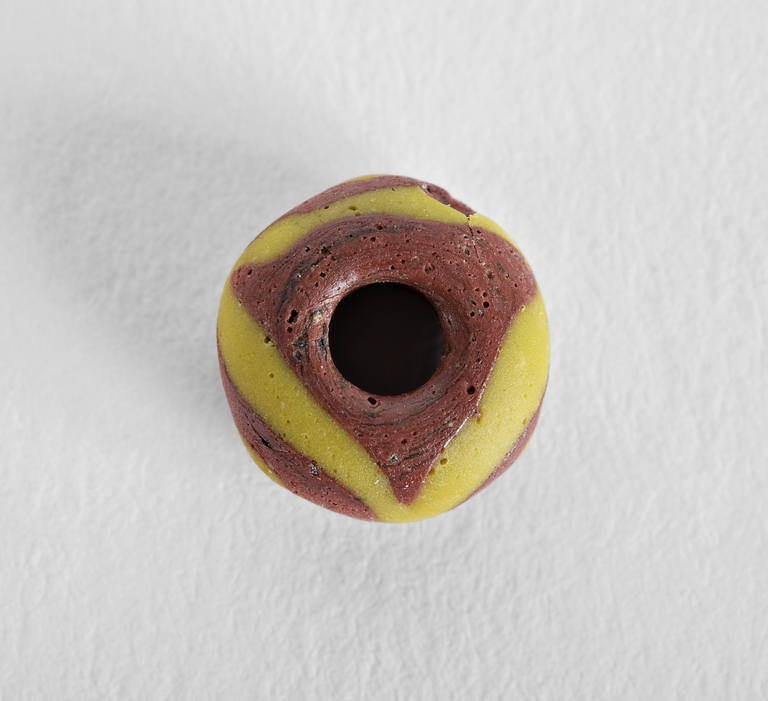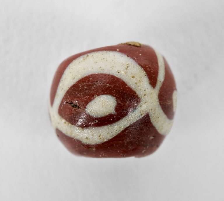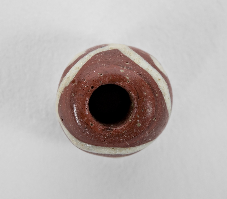 Tre vaghi a sfera schiacciata in pasta vitrea rossa con due filamenti ondulati che si intersecano fra loro, uno presenta filamenti bianchi, uno gialli, sul terzo si individuano alcune tracce di filamenti gialli.
