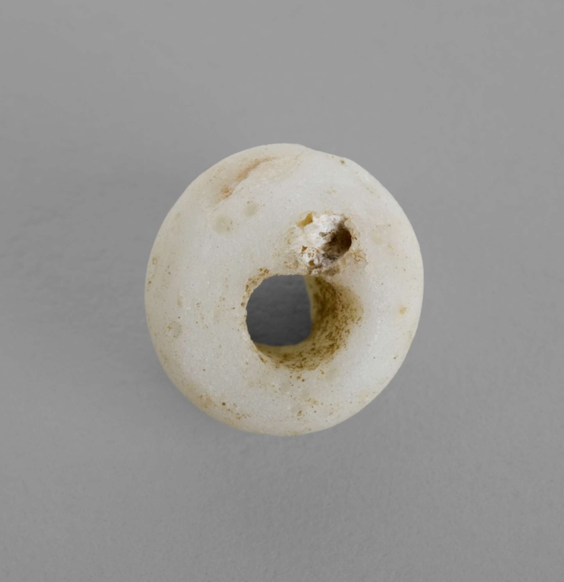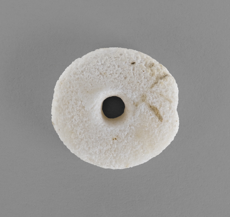 Due vaghi in pasta vitrea bianca, privi di decorazione. Il primo presenta una forma a disco con il foro passante posizionato al centro di questo. Il secondo ha una forma molto prossima ad una sfera leggermente schiacciata.
