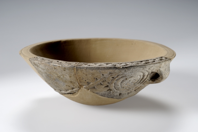 Scodella a tesa con piccola ansa canaliculata e decorazione a spirale