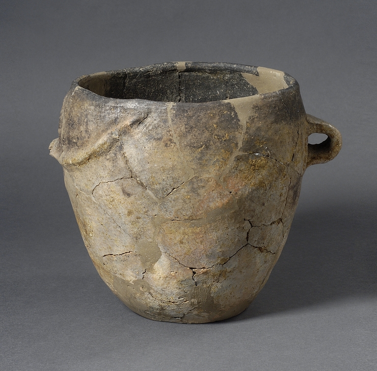 Piccolo dolio di forma troncovoide con ansa a nastro e decorazione a cordoni.