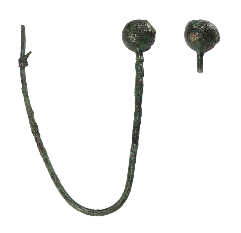 Due spilloni, di cui uno privo del gambo, con testa sferica decorata a bulino con motivo a ruota raggiata (6 raggi) sulla sommità e motivi angolari sui due registri delimitati da tre linee incise orizzontali; alla base una decorazione incisa a zig zag. Nell'esemplare meglio conservato collo leggermente ingrossato con 5 linee orizzontali delimitate superiormente e inferiormente da una linea a zig-zag, nella parte terminale del gambo elemento rettangolare frammentario con due fori. Entrambi gli spilloni risultano danneggiati dal rogo funebre e intenzionalmente piegati o fratturati.