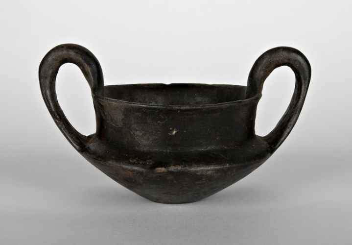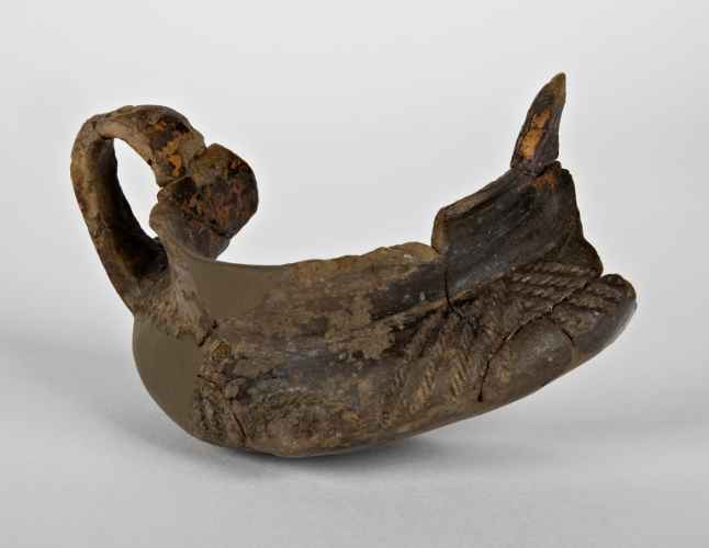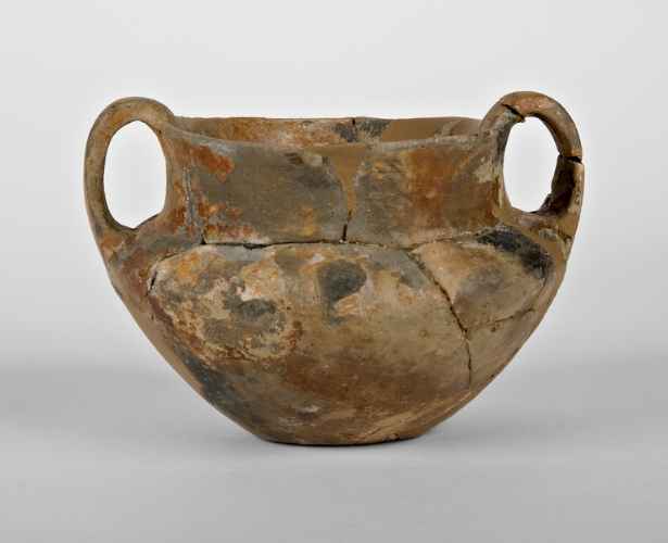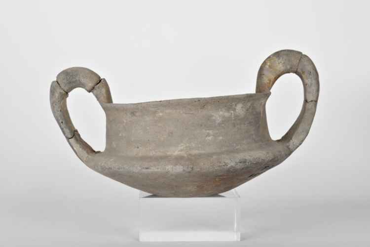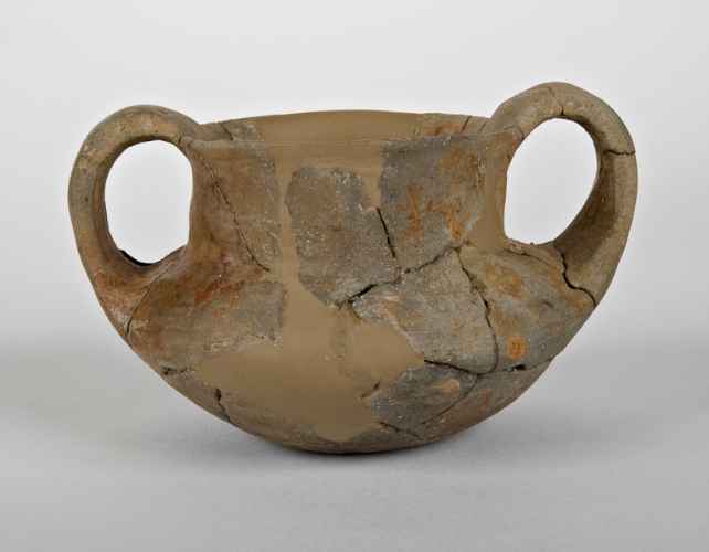 Frammento di tazza biansata in ceramica d'impasto chiaro, di cui si conservano una delle anse a bastoncello e parte della carena.