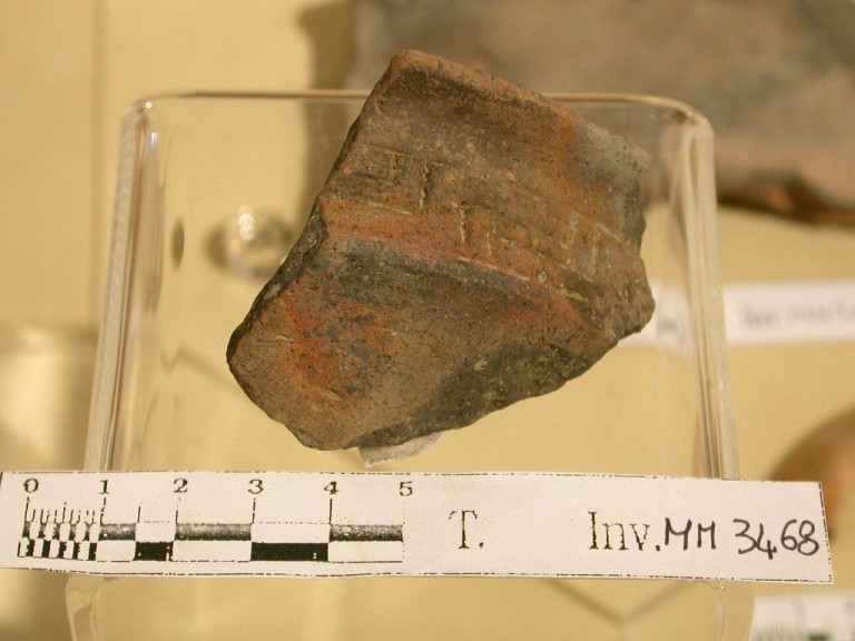 Orlo di tazza carenata con meandro sulla parete esterna e triangoli impressi sull'orlo a tesa. Impasto rossiccio.