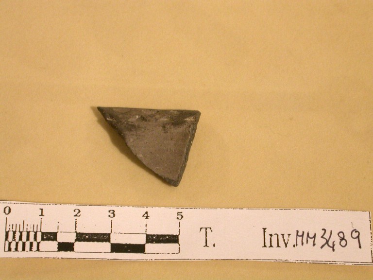 Orlo con decorazione sulla superficie interna: motivo a triangolini opposti al vertice. Impasto grigio-nerastro.