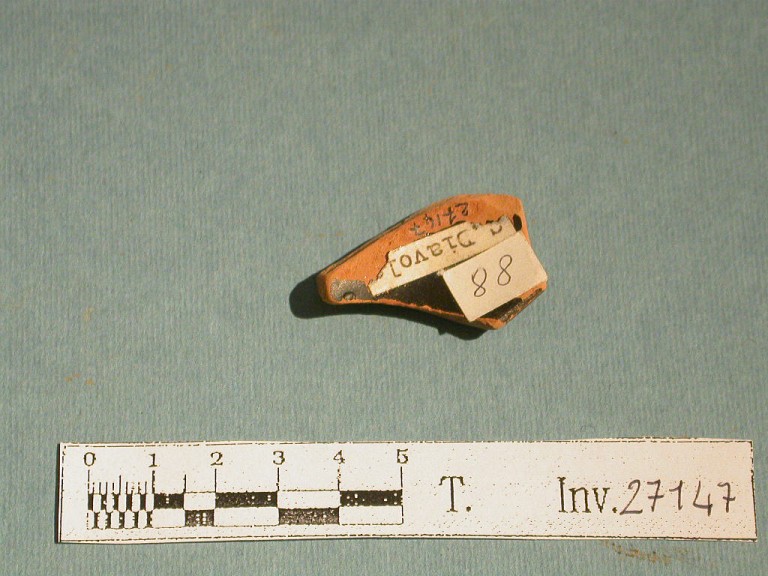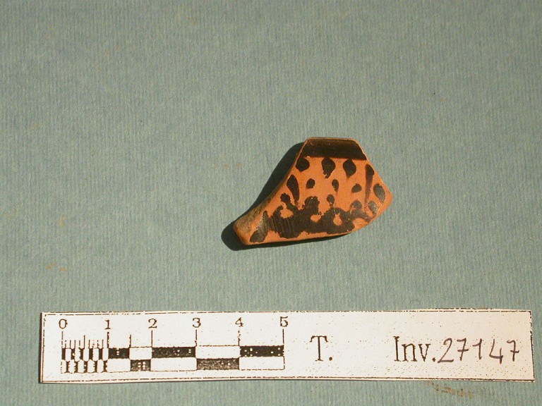 Frammento di orlo di kylix, è presente un attacco di ansa. Argilla arancio. Interno interamente verniciato; esterno con motivo vegetale a palmette con cinque petali alternate a boccioli di loto.
