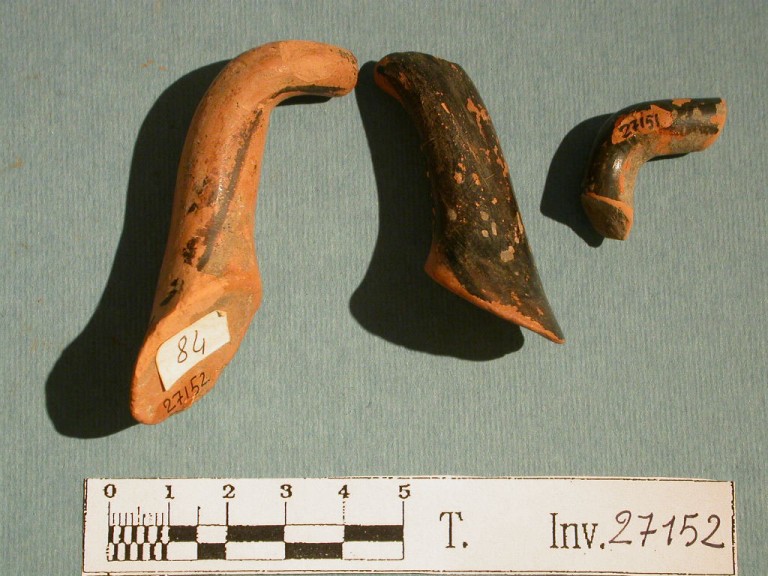 Frammento di ansa di kylix: ansa obliqua a bastoncello. Argilla arancio; vernice nera, abbastanza lucente, solo sul lato esterno.