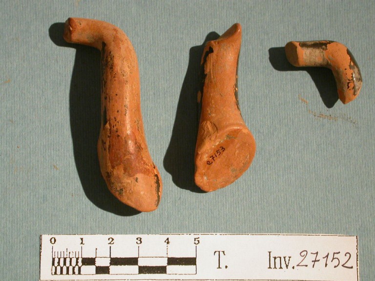Frammento di ansa di kylix: ansa obliqua a bastoncello. Argilla arancio; vernice nera poco conservata.