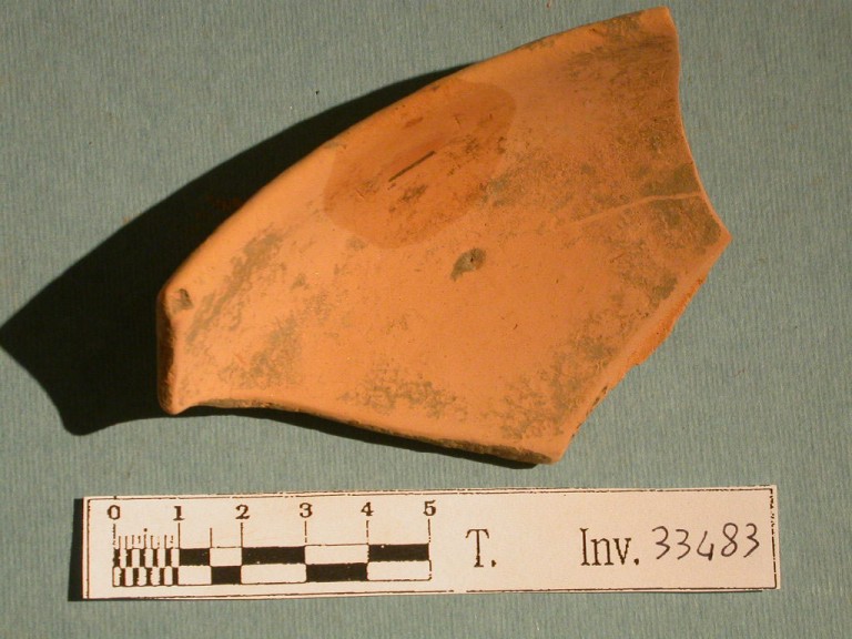 Orlo di ciotola a vasca troncoconica, carenata. Argilla arancio giallastra, polverosa.