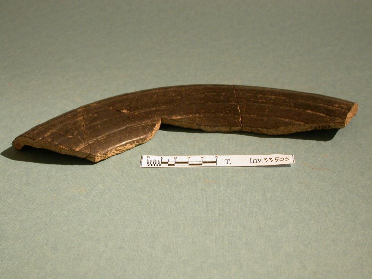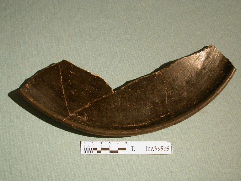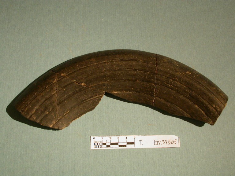 Frammento di coppa a labbro svasato, a tesa, con larghe solcature sulla superficie interna.