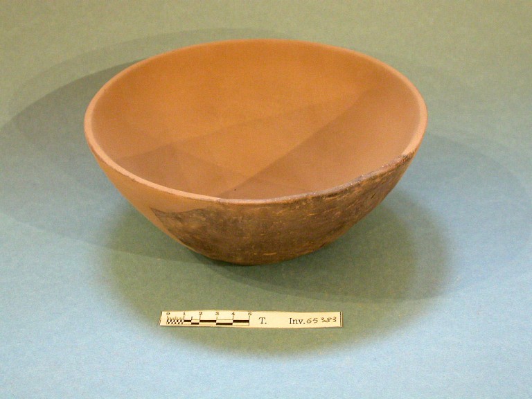 Porzione di scodella a vasca troncoconica, fondo piatto e orlo indistinto, piatto. Impasto bruno-arancio.