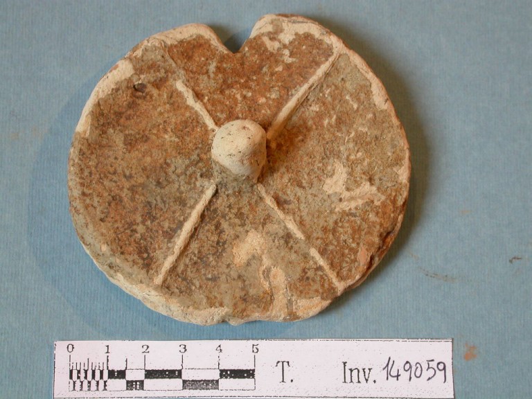 Tappo di anfora di forma circolare con, al centro, presina cilindrica; sulla faccia superiore sono quattro cordoni in rilievo che dividono la superficie in quattro settori, due ad angolo ottuso e due ad angolo acuto. Argilla biancastra con incostrazioni.