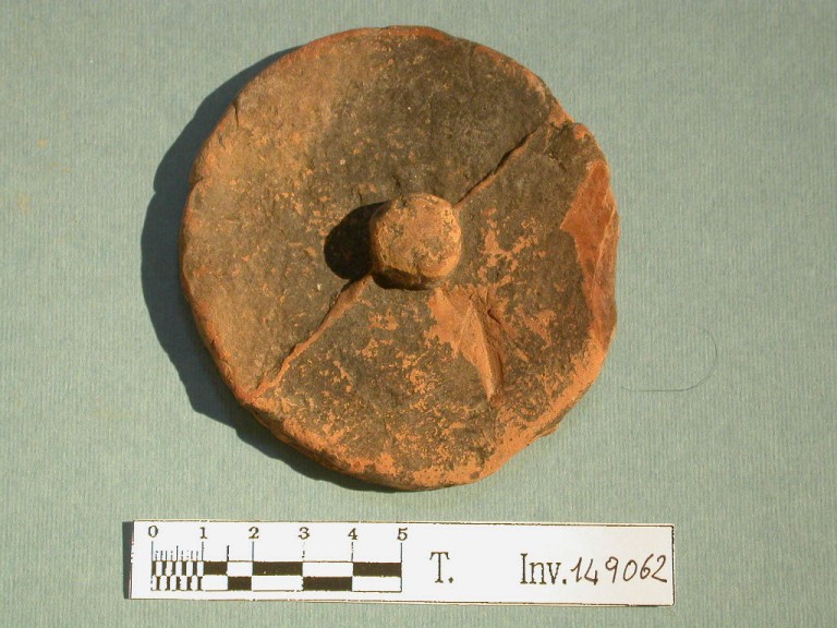 Tappo discoidale di anfora con presina centrale cilindrica, la faccia superiore è divisa in due semicerchi da una linea in rilievo.
