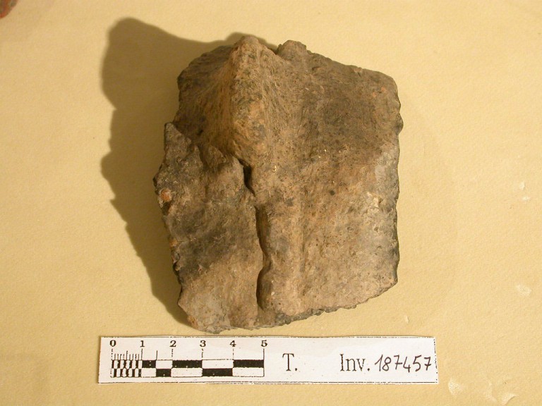 Piccolo orcio con orlo rientrante e con impressioni digitali. Parete decorata da un cordone parallelo all'orlo su cui è impostata una presa quadrangolare. Impasto bruno-grigiastro.