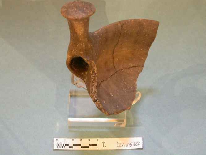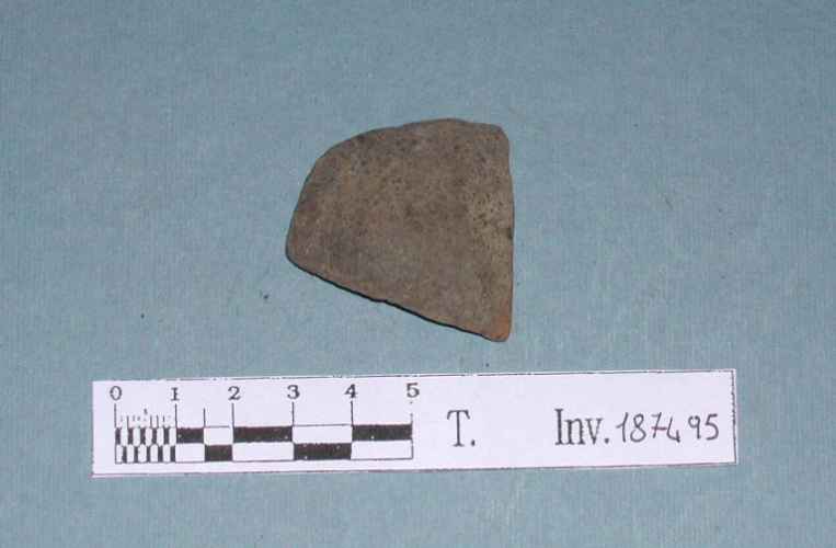 Scodella carenata con attacco di ansa. Impasto bruno.