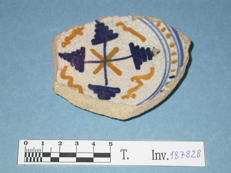 Rimane il fondo decorato con motivi geometrizzanti nei colori del blu, azzurro e arancio. Motivo a croce rinforzata con monticello entro cornice puntinata. Piede a disco.