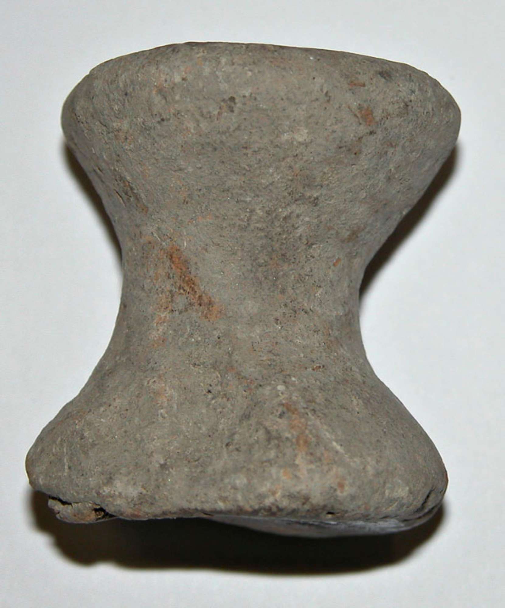 Rocchetto: corpo cilindrico con pareti fortemente concave, estremità appiattite. Impasto grigiastro poroso, grossolano.
