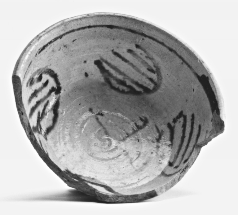 Ciotola emisferica di ceramica ingobbiata giallo chiaro, dipinta in ramina e ferraccia. Orlo arrotondato e cavetto ribassato. Esterno parzialmente invetriato. Piede a disco concavo. Impasto rossastro.