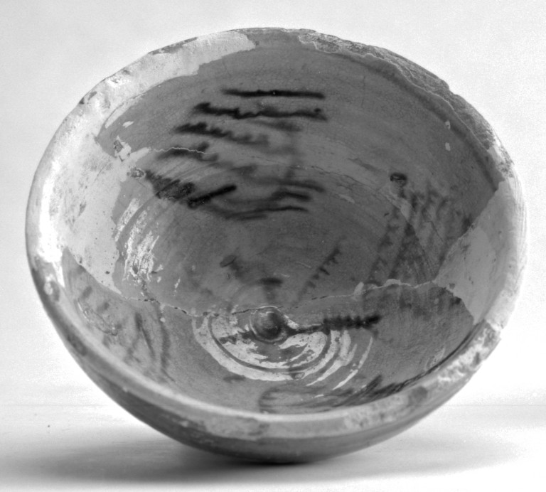 Ciotola emisferica di ceramica ingobbiata giallo chiaro, dipinta in ramina e ferraccia. Orlo arrotondato e cavetto ribassato. Esterno parzialmente invetriato. Piede a disco concavo. Impasto rossastro.