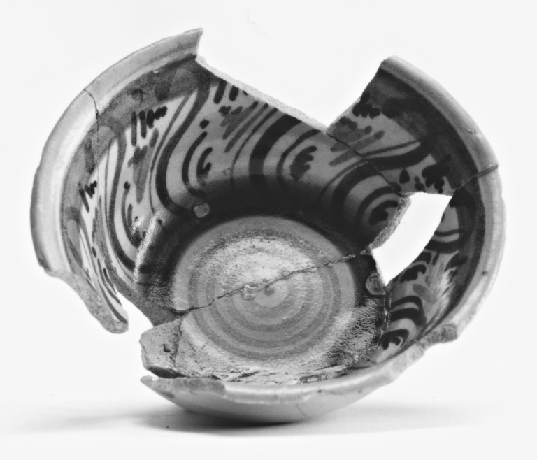 Cavetto: motivo geometrico "a spirale". Parete: motivi geometrici uncinati separati da "monticelli" e "ciuffi".