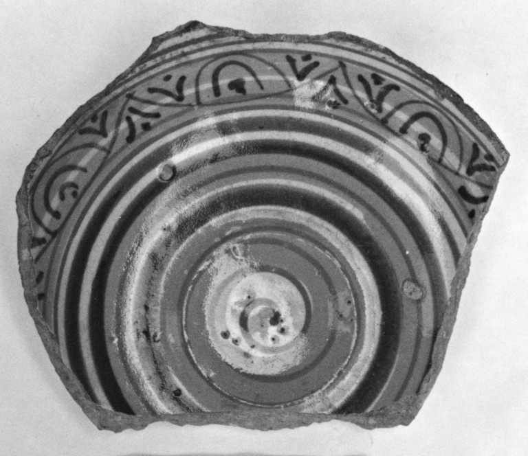 Ciotola di ceramica smaltata e dipinta in blu, giallo e arancio. Accenno dell'orlo estroflesso e arrotondato. Cavetto definito da una nervatura. Esterno con costolatura sotto l'orlo e dipinto. Fondo concavo. Impasto giallo rosato.