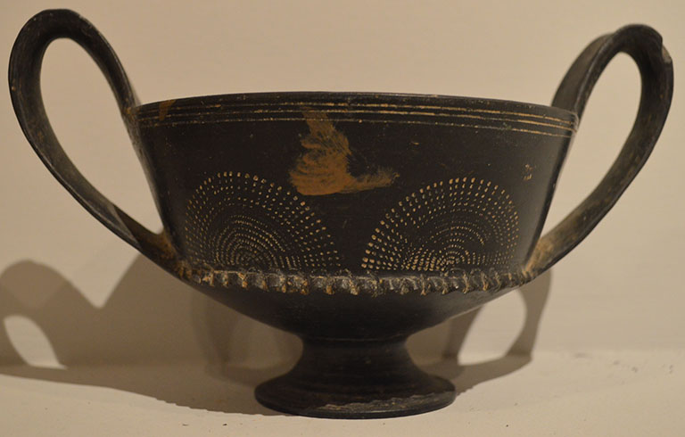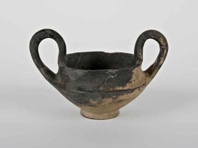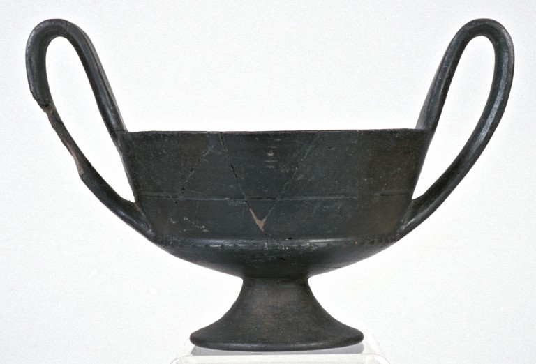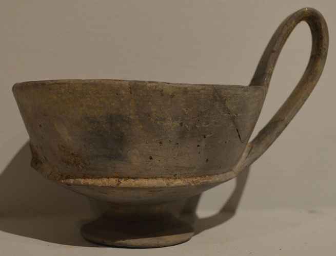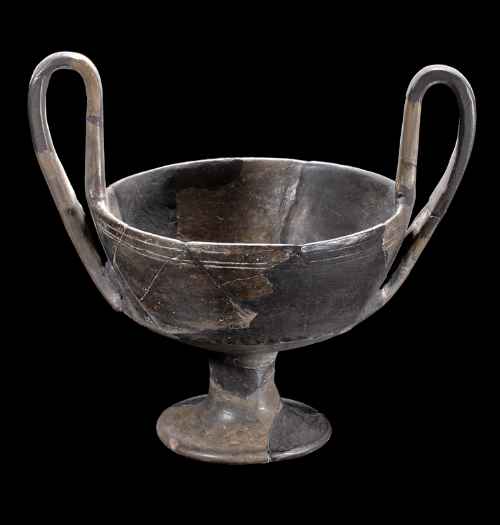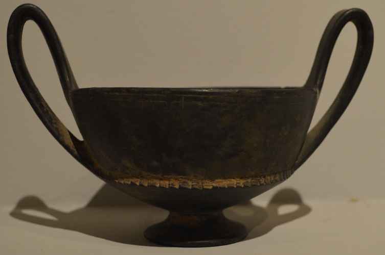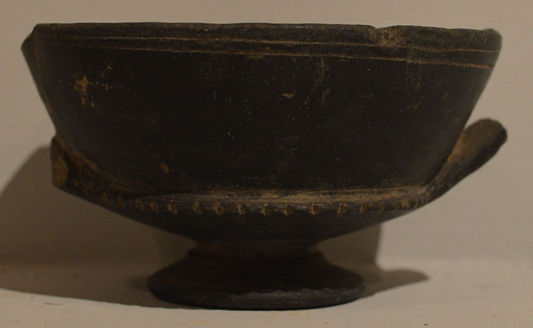 Kantharos in bucchero; parete svasata, alta ansa a nastro, piede a tromba. Decorazione sulla parete solcatura orizzontale, sulla carenatura tacche incise.
