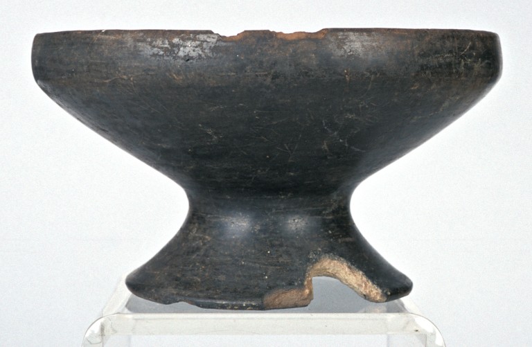 Ciotola ad orlo introflesso, vasca arrotondata, medio piede troncoconico. Corpo ceramico arancio con piccoli inclusi chiari, superficie nera lisciata a stecca.