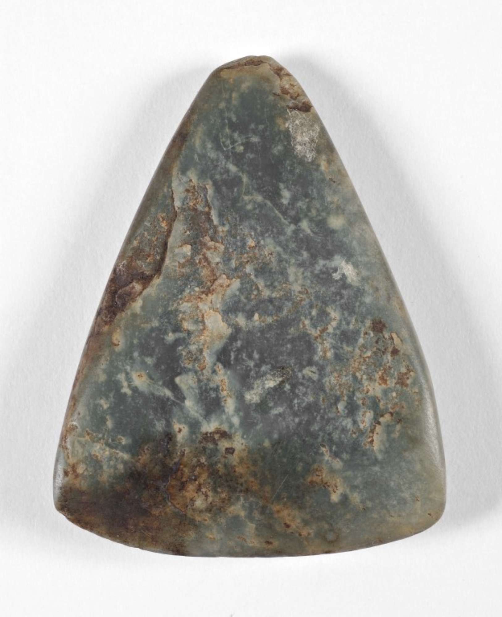 Accetta in pietra verde levigata, a profilo subtriangolare appiattito, tallone appiattito, tagliente leggermente ricurvo. La superficie è stata interamente levigata; si rilevano delle abrasioni in vari punti.