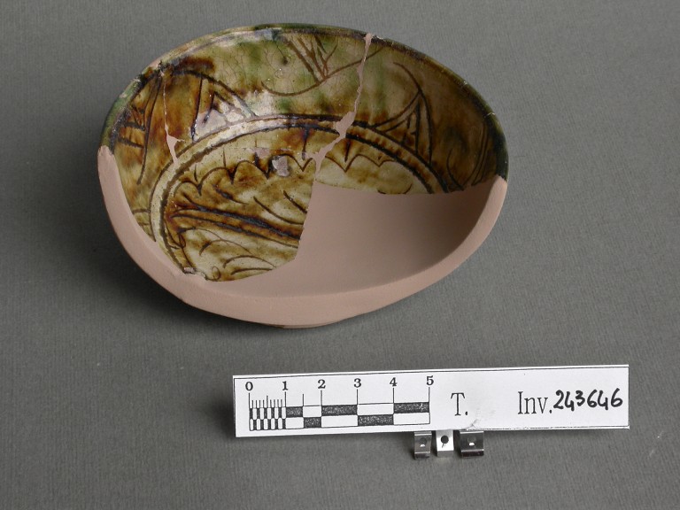 Ciotola emisferica su piede a ventosa, al centro motivo a foglia graffito.