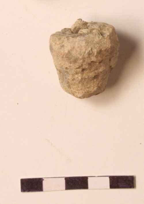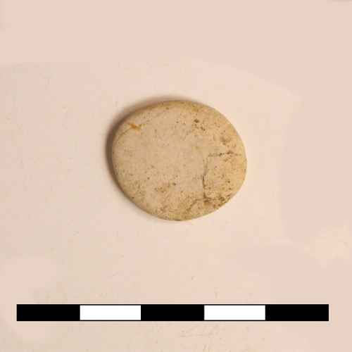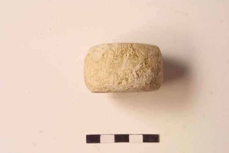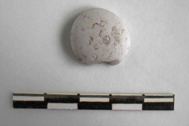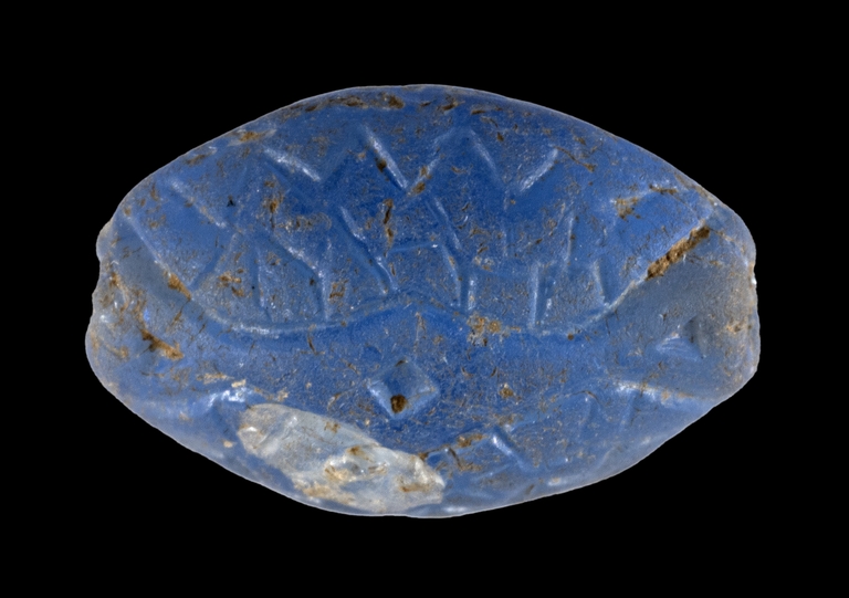 Vago di collana in pasta vitrea di colore azzurro con decorazione geometrica a zig-zag incisa, forma oblunga.